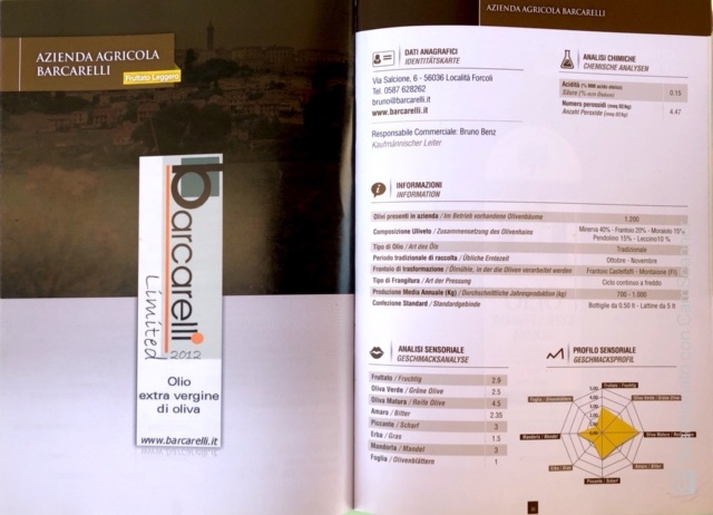 Barcarelli limited ®     Olio extra vergine - spremuto a freddo - acido 0,16% - perossidi 4,04 - polifenoli 552